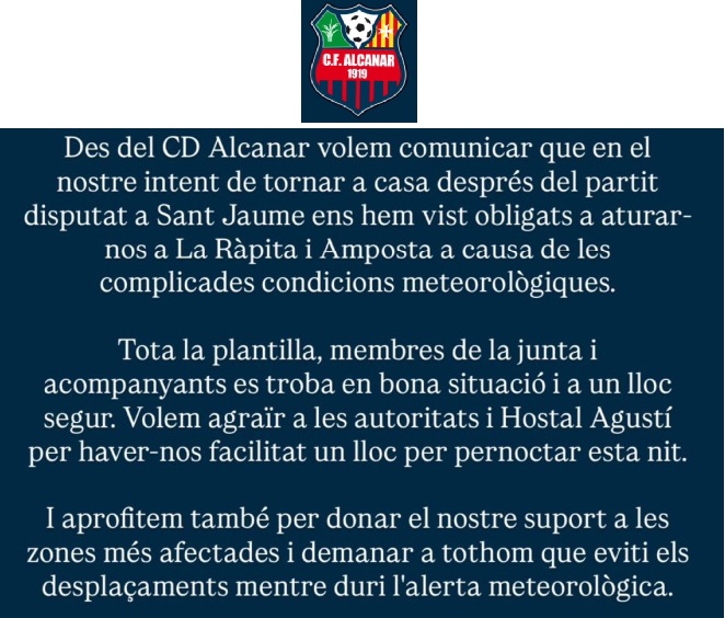 Desgraciadament, no sols ha sofert la dura situació climatològica la Rapitenca sinó que han estat molts més a les Terres de l’Ebre. El ‘Diari de Tarragona’, ja va publicar aquest dilluns l’odissea que van sofrir Alcanar i Amposta en els seus desplaçaments que els van obligar a passar la nit a La Ràpita i Tortosa, respectivament. Un altre episodi que es podria haver evitat si hi hagués hagut coordinació des de la Federació Catalana.