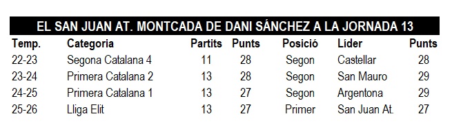 Dani Sánchez afronta la seva quarta temporada com a entrenador del San Juan At. Montcada i es pot dir que quan arriba Nadal, els seus números acostumen a ser semblants. La novetat enguany és que és líder, ja que fins ara sempre es menjava el raïm com a segon classificat. La xifra de punts es mantenia entre els 27 i els 28 amb un detall a destacar. La temporada 2022-2023, a Segona Catalana, els montcadencs només havien jugat 11 partits a la jornada 13, per la retirada del Cerdanyola B.